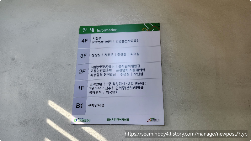 경찰서와 면허시험장에서 발급신청과 발급을 하고 있지만 강남경찰서는 면허발급업무가 없습니다. 강남 면허시험장을 방문하였습니다. 주차장에 주차를 하고 들어갑니다. 강남면허시험장은 주차료가 있으니 확인하시고 방문하셔야 합니다. 30분에 1000원으로 시작하였던 것 같습니다. 그리고 500원씩 추가였나.... 면허만 신경을 쓰다 보니 다른 건 하나도 자료를 남기지 못했습니다.