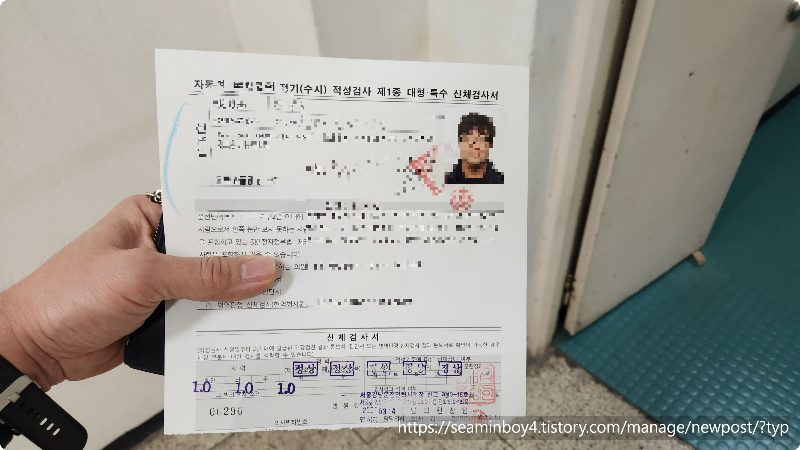 10초 만에 신체검사 종료합니다 시력검사 청력검사 쪼그리고 앉았다가 일어나기.. 이건 받을 때마다 이상하게 생각이 듭니다. 노령면허소지자들 순간대처 능력검사나 인지능력 검사 같은 걸 해서 노인분들의 운전을 방지하는 것이 나을 것 같은데 나라님들이 하시는 일이라 잘 모르겠습니다.