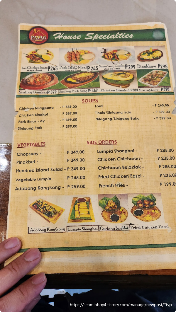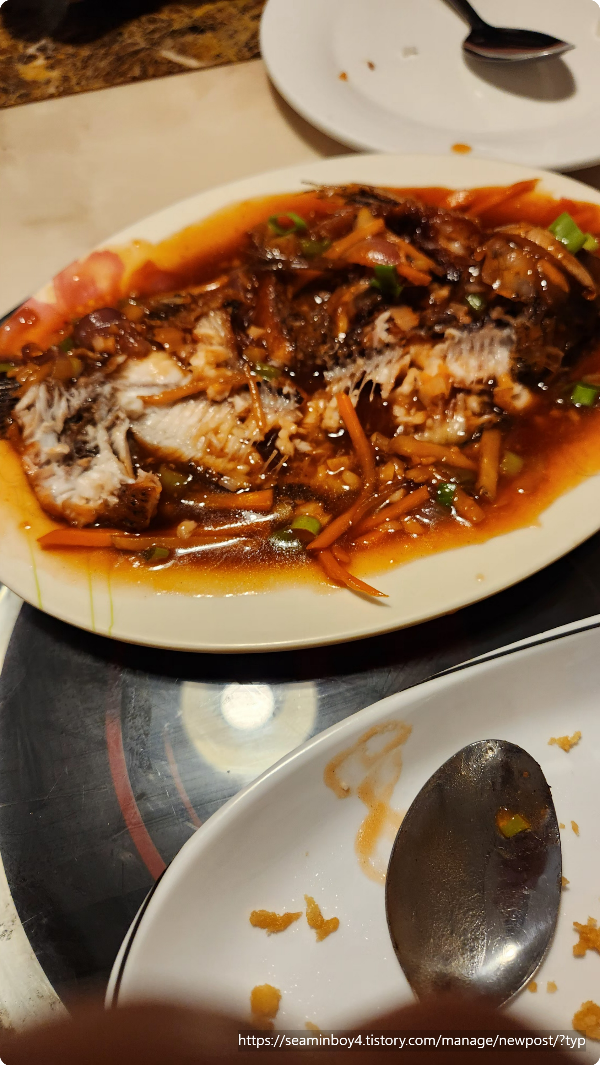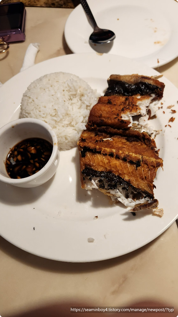 저녁을 메뉴를 정해봅니다. 같이간 친구들중 1명은 어디든지 가자주의 나머지 1명은 장사를 하는 친구여서 이것저것 보는 친구입니다. 돌아보면서 이곳저곳을 돌아보다가 한곳으로 들어갑니다. 중국계 필리핀 식당인듯합니다. 메뉴는 3개를 시켜서 먹었고 생선조림과 오징어튀짐 비슷한것 그리고 생선구이등입니다..(중국계스타일)