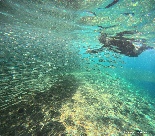 정어리 때들은 수면에서 3m 깊이 정도까지에 정말 많이 있습니다. 파도도 그리 높지 않아 스노클링 하기에 정말 좋았습니다. 이곳에서 1시간 정도 정어리 때들과 스노클링을 하고 마무리됩니다. 정리해서 숙소로 향하니 시간은 2시경 정도가 되었습니다.