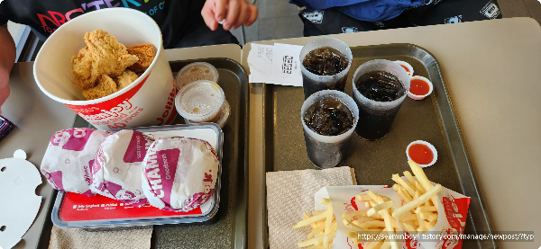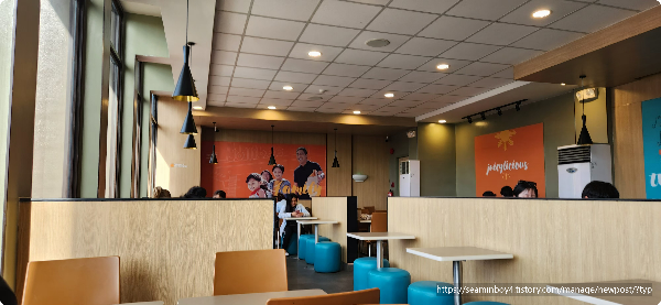 기다렸다가 음식을 받아서 2층으로 올라갑니다. 아~ 시원합니다. 에어컨 잘됩니다. 햄버거는 우리나라 기본버거처럼 작습니다. 그냥 간식용? 감자튀김도 비슷합니다 음료수는 조금 아쉽기는 합니다. 양이 너무 작습니다. 치킨은 크게 나오는데 kfc치킨처럼 큰덩어리로 4개였나 6개였나 그랬던 거 같습니다. 스파게티는 불은 스파게티~ 보편적인 맛입니다. 쪼금 짭짭할 느낌은 있지만 호불호가 갈릴정도는 아닙니다. 여유 있게 친구들과 늦은 점심을 해결합니다.