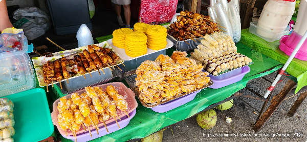 우리나라의 길거리음식처럼 사람들이 노상에서 서서 먹습니다. 구운 바나나와 어묵을 잘라 튀긴것 코코넛 주스 등을 팔고 있습니다. 구운 바나나와 어묵을 잘라 만든 튀김 금액이 정확히는 기억이 나지 않지만 구운 바나나가 2가지 맛이고 1 꼬치당 15 패소 그리고 어묵 잘라서 튀긴 거 한 컵에 15 패소 코코넛주스는 크기별로 있었는데 중간사이즈였던 것으로 기억이 나고 20 패소였던 것 같습니다. 350원~500원 정도의 간식입니다.