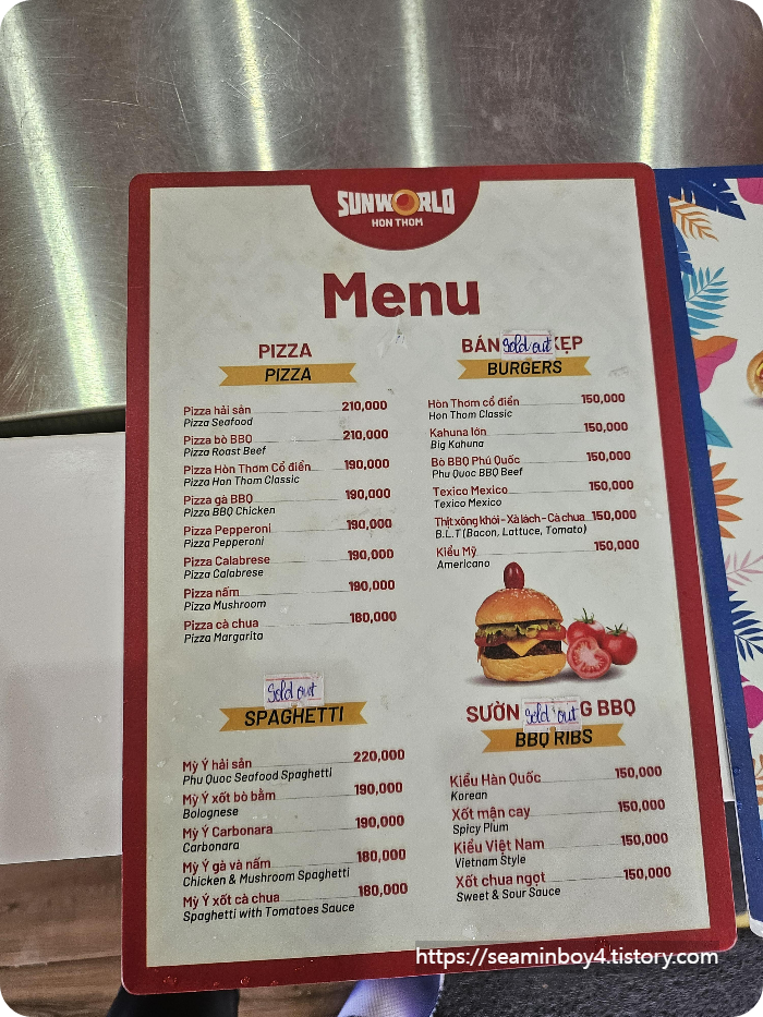 점심은 워터파크 중간중간에 있는 피자로 해결했습니다. 맥주는 메뉴에있지만 솔드아웃이라고 합니다. 피자2개와 음료를 시켜 점심을 먹습니다. 카드 515000동(28300원) 입니다.. 주문을 하는동시에 다른곳에서 음식이 출발하는것 같습니다. 조리는 하지않고 음식을 가지고 오면가져 가라고 합니다.